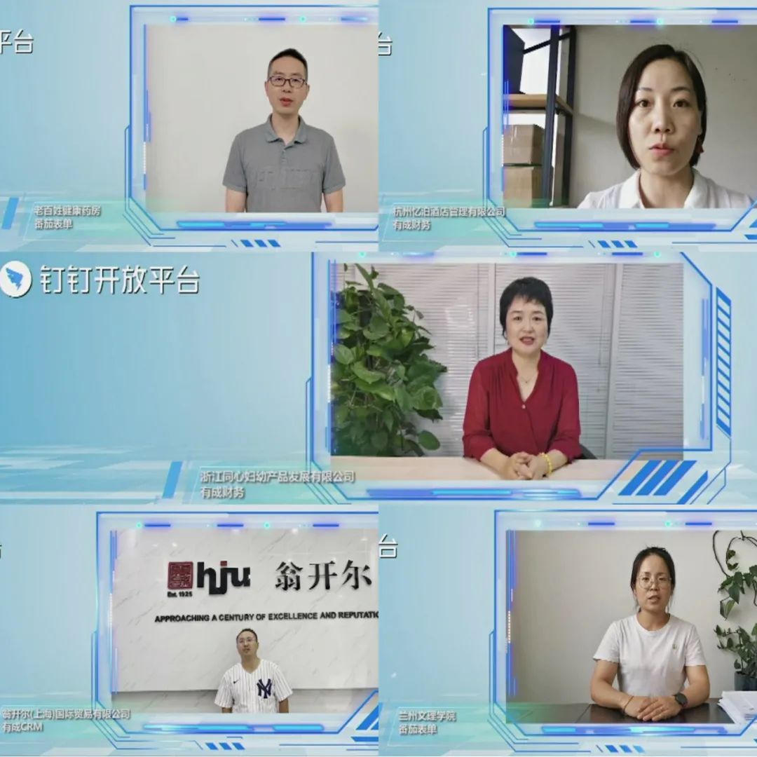 大会以服务生态伙伴和开放平台客户视频集锦开场。有成CRM客户代表翁开尔(上海)国际贸易有限公司,有成番茄表单客户代表老百姓大药房集团、兰州文理学院,有成财务的客户代表浙江同心妇幼产品发展有限公司(基诺浦)、杭州忆泊酒店管理有限公司分别通过视频形式,远程讲述如何通过使用钉钉和有成产品,进行企业管理的数字化转型。