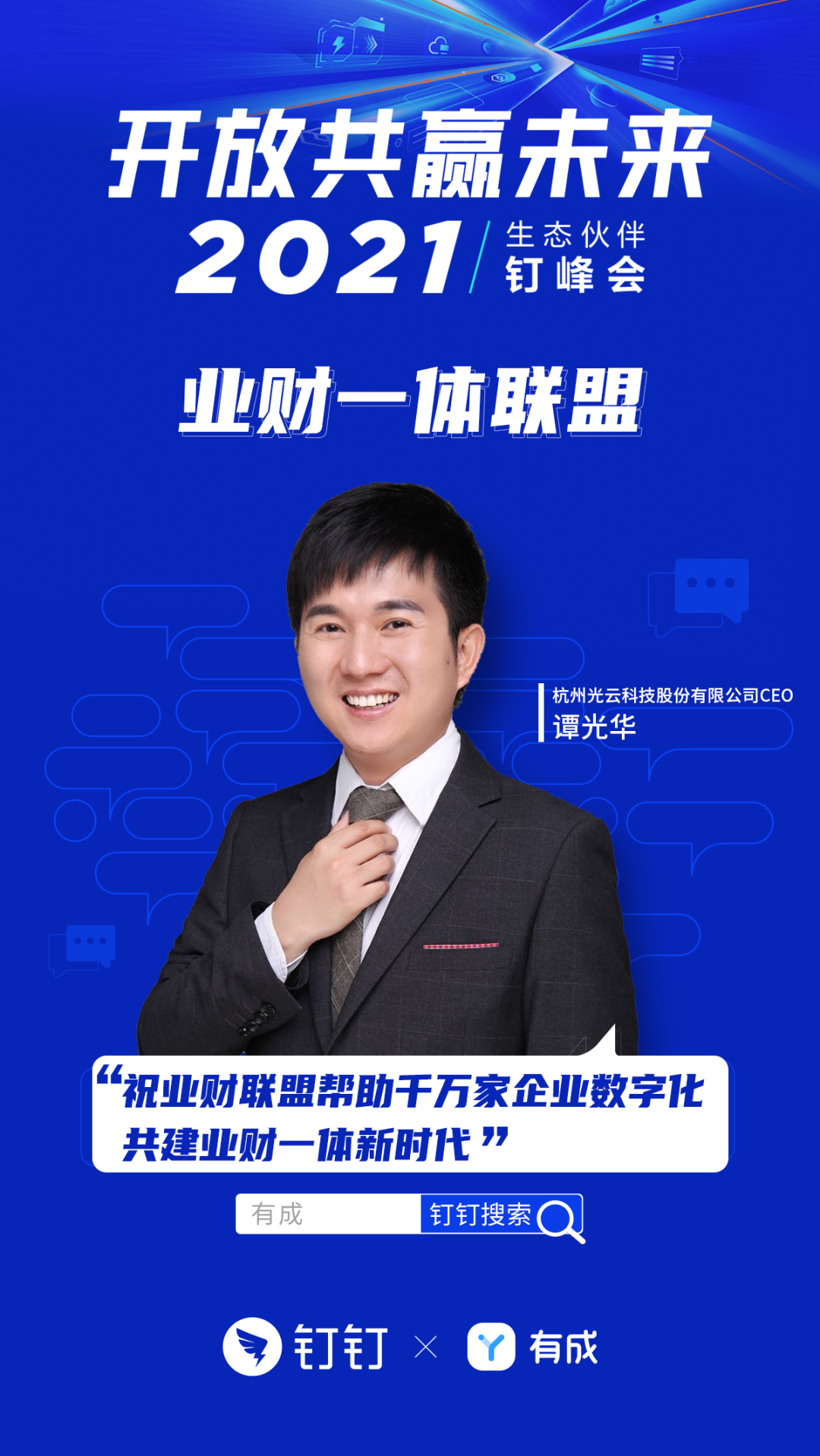 此次峰会的另一个重要议程——钉钉重磅发布了业财联盟,有成作为业财联盟的首批成员,高调亮相发布会现场,同时BG大游集团科技CEO谭光华先生也到现场,与联盟成员一起开启业财一体化新时代。