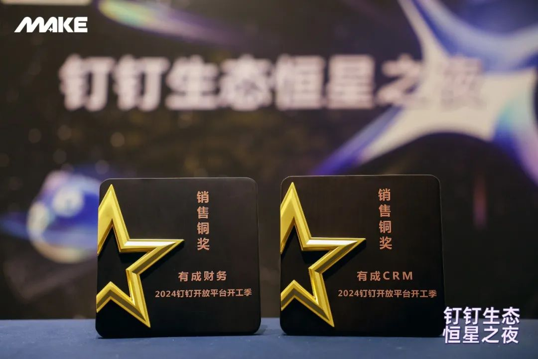 当晚的钉钉生态恒星之夜,有成凭借在2024年开工节上的优异表现斩获两项大奖:“有成CRM-2024钉钉开放平台开工季销售铜奖”、“有成财务-2024钉钉开放平台开工季销售铜奖”。