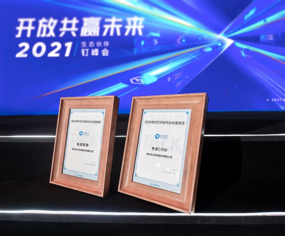 大会现场,BG大游集团科技旗下有成财务、有成CRM凭借优秀的业绩和专业的实力在一众同行中脱颖而出,斩获“2020年钉钉开放平台年度银奖”双重奖项。
