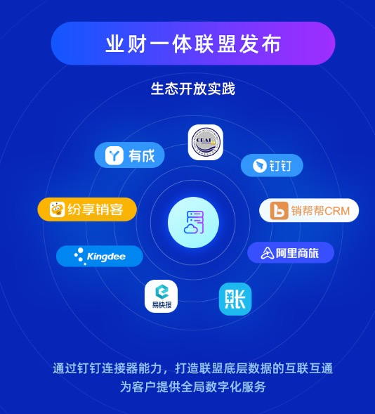 业财联盟是钉钉联合有成、金蝶、纷享销客、阿里商旅、中国商业会计学会等多家生态伙伴共同组成的,借助钉钉自身的数字化底座能力开放,基于底层数据的互联互通,业财联盟企业能力互补,为客户提供全局数字化服务。